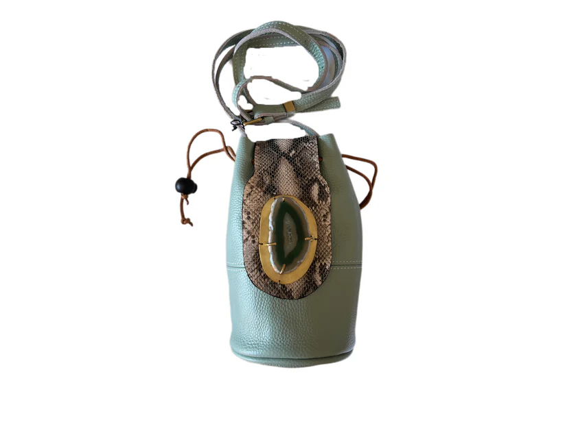 Bolso bombonera de piel. Piel de vacuno de color azul, con piel graba tipo serpiente y aplique de ágata natural color verde sobre base de latón.