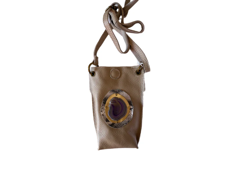Piel de vacuno de color taupe, con piel graba tipo serpiente y aplique de ágata natural color morado sobre base de latón.