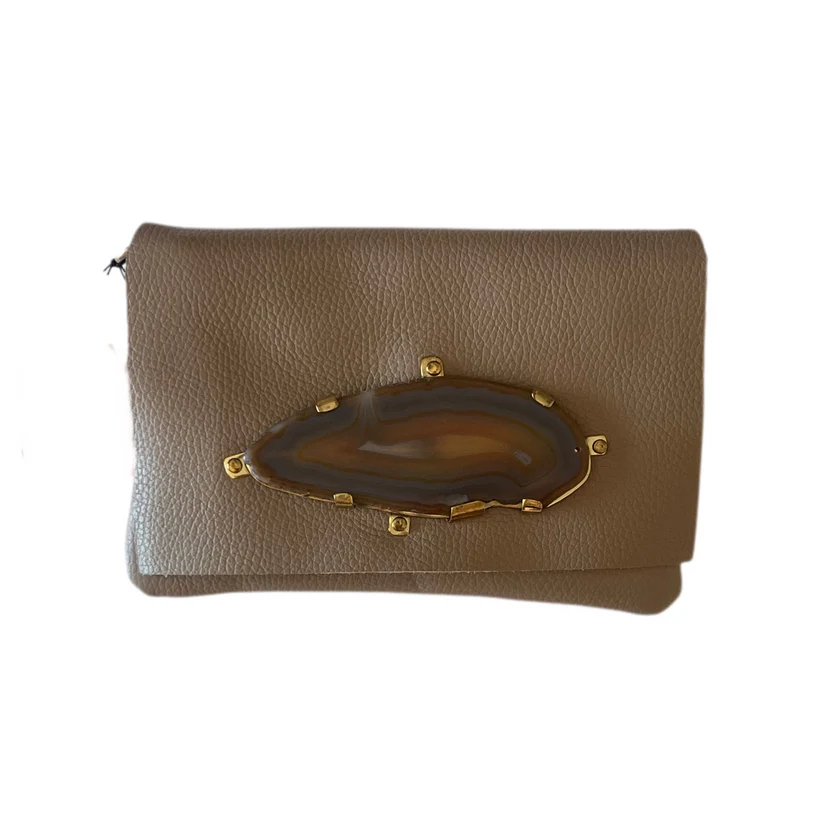 Bolso cartera de piel. Piel de vacuno de color beige, aplique de ágata natural color marrón sobre base de latón