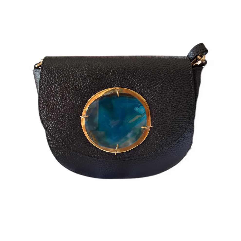 Bolso rígido de piel. Piel de vacuno de color negra con aplique de ágata natural color azul sobre base de latón