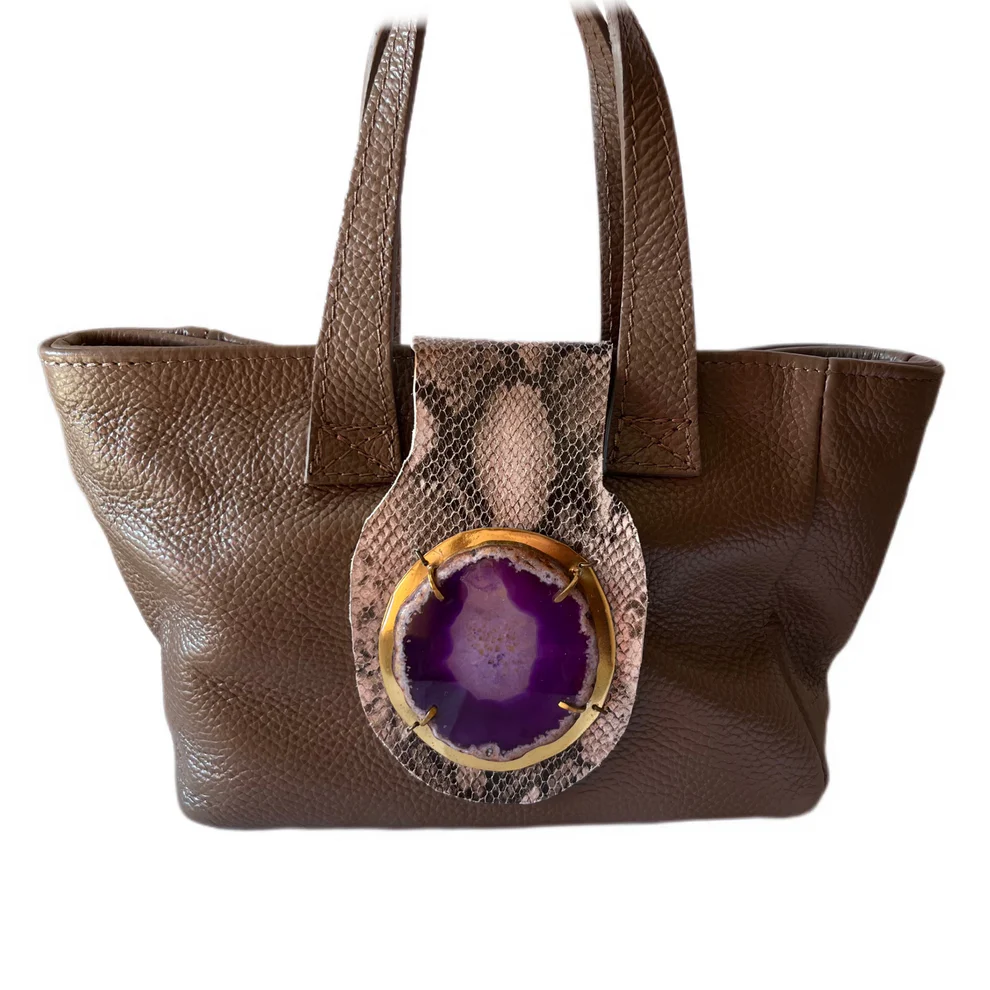 Bolso de piel. Piel de vacuno de color taupe, con piel graba tipo serpiente y aplique de ágata natural color morado sobre base de latón.